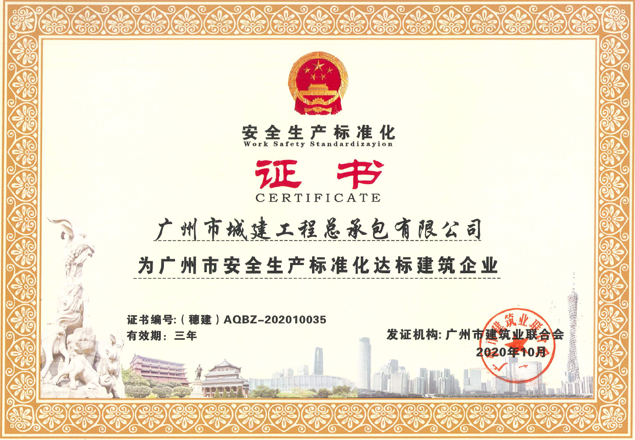 公司經(jīng)過(guò)開(kāi)展企業(yè)自評(píng)和專家到企業(yè)、施工現(xiàn)場(chǎng)進(jìn)行復(fù)評(píng)等兩個(gè)階段的評(píng)定,順利通過(guò)安全生產(chǎn)標(biāo)準(zhǔn)化的達(dá)標(biāo)認(rèn)證工作,獲得廣州市安全生產(chǎn)標(biāo)準(zhǔn)化達(dá)標(biāo)建筑企業(yè)證書。