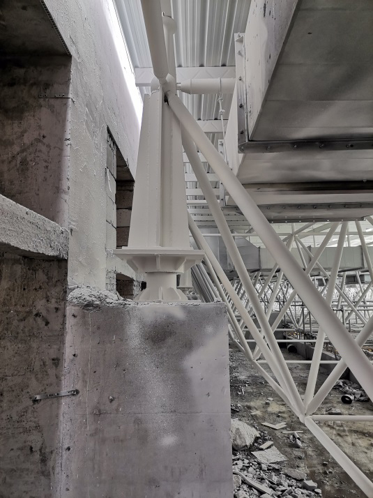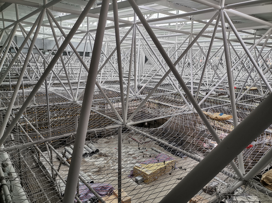 現場施工人員從工程特點、施工程序、施工工藝、施工技術等方面作了詳細講解,雙方就關鍵技術點進行了全方位技術交流。該網架結構采用網架桿件、螺栓球等網架材料,整體網架尺寸為39x42米,重量約69.5噸,吊裝提升高度約14.9米。根據該網架的特點,選用高空散裝方法安裝,將網架分為幾個單元,首先在地面進行每塊區域單元網架的拼裝,然后進行單元網架整體吊裝,最后在空中拼裝成一個大整體。個別單元網架由于局部角點問題,如安裝死角、吊臂位置受限等特殊因素導致吊車無法發揮正常使用功能,將網架材料運送至事先安裝好的一個6X6米、高12米的鋼架平臺上,在平臺上拼裝成一球四桿的小單元網架后,然后人工搬運小單元網架到安裝位置進行整體拼裝。為防范安全風險,在散裝的拼接過程中,散裝區域下方確保有一個鋪滿安全網的腳手架平臺,做好高空作業人員防護措施,避免拼裝過程的安全隱患。