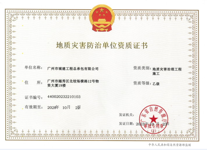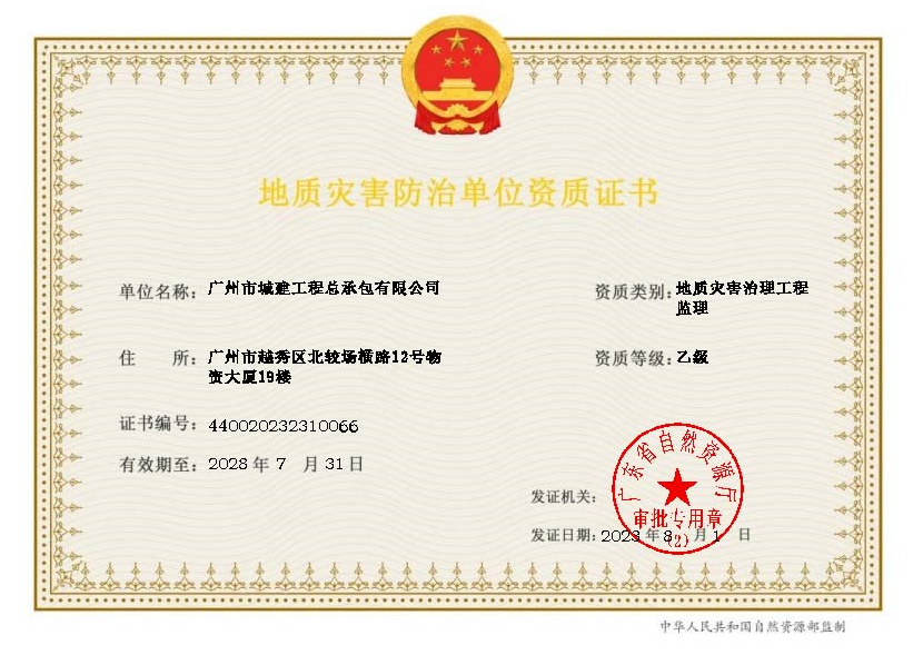 2023年8至10月,公司成功獲批地質災害治理工程施工乙級、監理乙級、地質災害評估和治理工程勘查設計乙級資質。