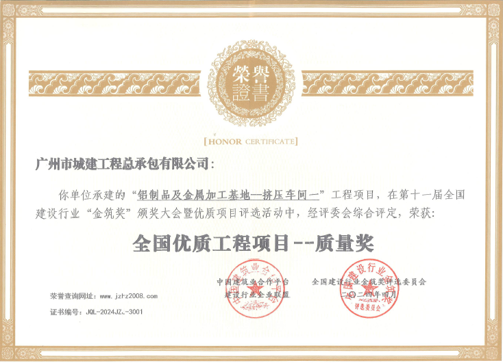 4月,公司積極參加全國建設行業“金筑獎”評選活動,經綜合評定,由公司承建的新興鳳鋁公司鋁制品及金屬加工基地--擠壓車間一工程項目榮獲第十一屆“金筑獎”全國優質工程項目——質量獎。 公司秉承“高標準、高質量、優...
